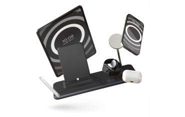 Stazione di ricarica universale per carica di iPad (con dock usb-c), iPhone (Magsafe 15W), AirPods ed Apple Watch (wireless 5W). Il dispositivo include uno slot per il posizionamento di Apple Pencil. Nella confezione è incluso un alimentatore da 45W con adattatori per prese EU/UK/US.