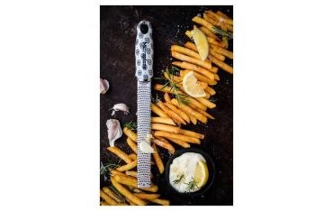 La grattugia Zester arriva dalla falegnameria alla cucina: con le caratteristiche forme oblunghe e sottili ricorda l’originale raspa per il legno. Con la classica Microplane che ha fatto storia grazie alle affilatissime lame foto-incise - made in USA - si potranno grattare finemente il formaggio a pasta dura, le scorze di agrumi, lo zenzero, l’aglio, le spezie, il cioccolato, i tartufi, le noci e molti altri ingredienti.
