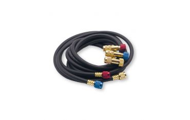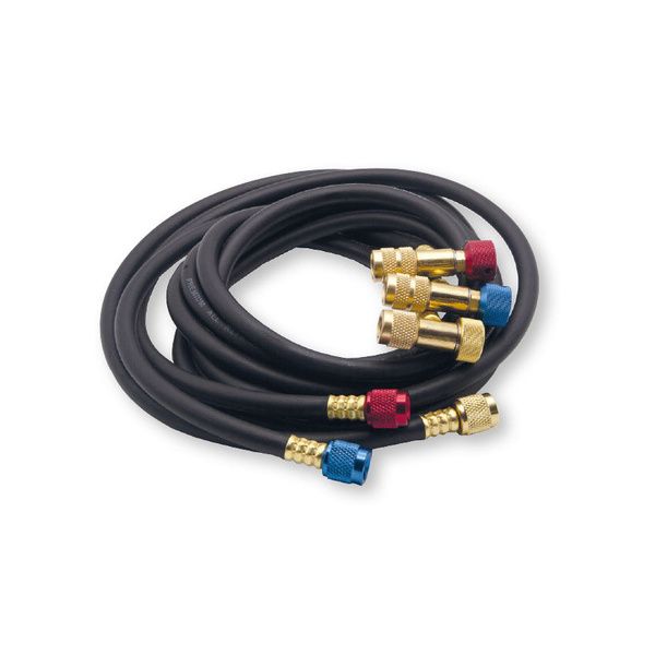 Tubo professionale di alta qualità in gomma multistrato nera con raccordi Safe Seal brevettati e codificati per colore: Rosso per alta pressione, Blu per bassa pressione e Dorato per vuoto e carica.