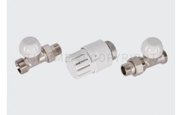 Kit 3 pezzi composto da: valvola diritta termostatizzabile, testa termostatica, detentore diritto con attacco per tubo rame, Pex e multistrato