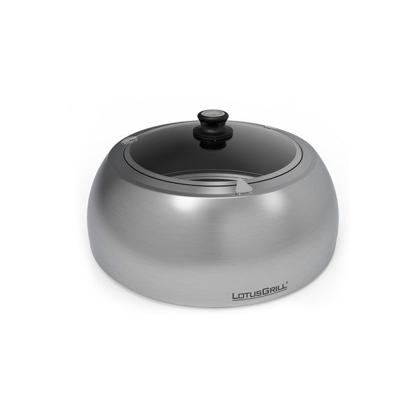 Cappa per LotusGrill in acciaio inox con una parte di superficie in vetro temprato trasparente. Consente una cottura veloce e costante grazie a una migliore distribuzione del calore. Grazie alla cappa si può cuocere, arrostire e cucinare alla griglia a bassa temperatura o semplicemente mantenere il cibo caldo.