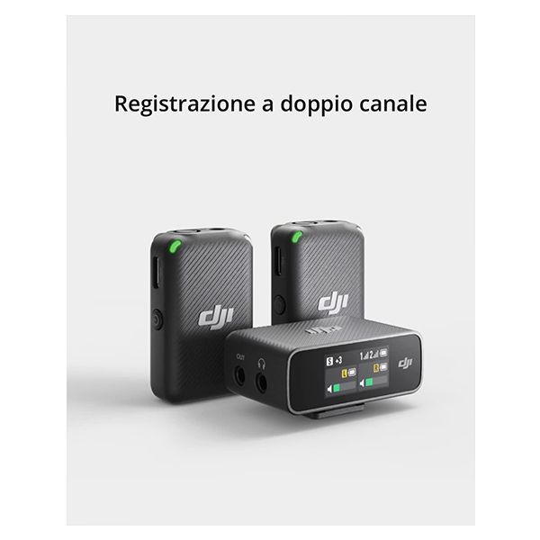 L'intero sistema DJI Mic è connesso in modalità wireless tramite una banda di frequenza stabile a 2.4 Ghz, che ti consente di muoverti in completa libertà mentre registri la tue avventure.
