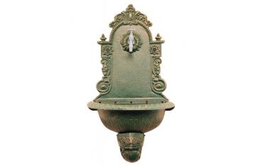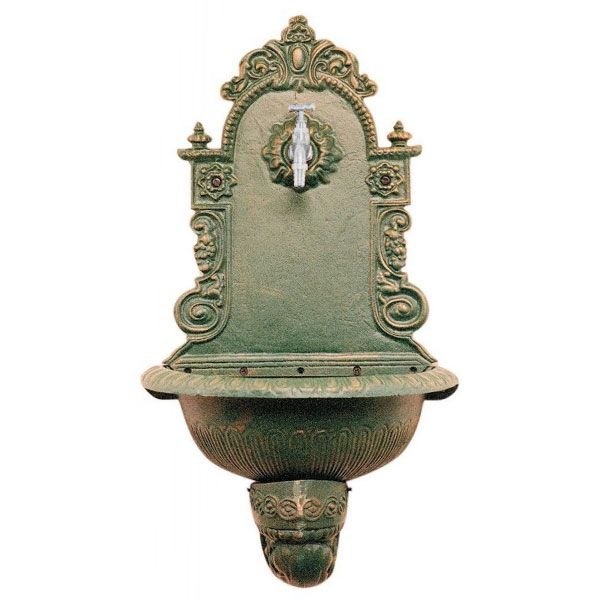 Fontana a parete in ghisa. Dimensioni cm 40x50x23 (LxAxP). Colore verde anticato. Fornita senza rubinetto.
