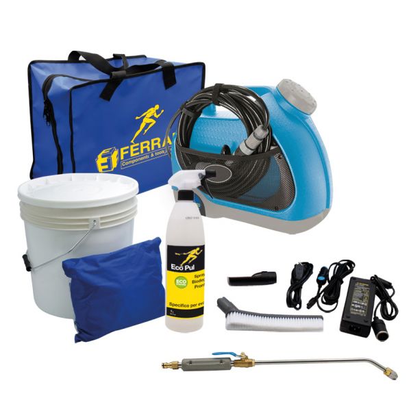 Kit Condywasher per il lavaggio delle unità interne ed esterne dei climatizzatori completo di idropulitrice portatile a bassa pressione, liquido detergente spray pronto all'uso, telo per il convogliamento del risciacquo del lavaggio, secchio per la raccolta del liquido e una pratica e robusta borsa che consente di riporre ordinatamente tutti i componenti dopo l'utilizzo Il capiente serbatoio della idropulitrice permette di effettuare l'operazione di risciacquo senza l'ausilio dell'attacco alla rete idrica.