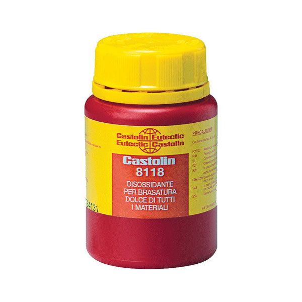 Prodotto in forma liquida e di colore traslucido opalescente. Da utilizzarsi con lega Castolin 8118. Indicato per la perfetta unione fra tutti i metalli (inox compreso). Si scioglie con acqua anche dopo l’impiego. Consente la brasatura anche dopo un lungo intervallo dall’applicazione. Non produce fumo.