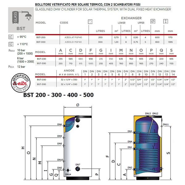 Bollitore Vetrificato per Solare Termico Due Scambiatori Fissi Elbi BST 300LT - A3E0L51PGP40