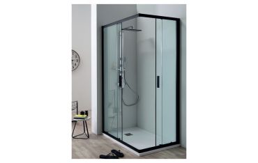 Box doccia della serie Rapid formato da due porte doccia con apertura scorrevole con installazione ad angolo. L’altezza del box è di 200 cm.