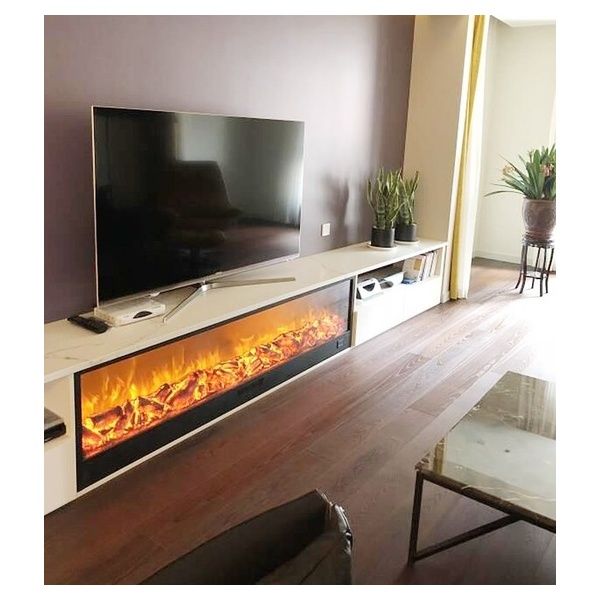 Grande caminetto elettrico da incasso e appoggio modello Amiata, 180 cm di lunghezza, effetto fiamma realizzato mediante LED e regolabile come intensità.