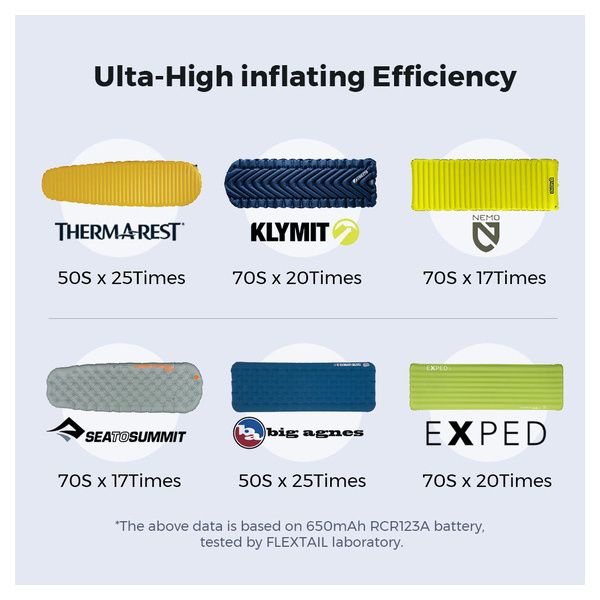 Pompa per gonfiaggio e sgonfiaggio materassini, pesa solo 340 grammi, alta efficienza. Dotata di 6 ugelli per l'utilizzo con marchi diversi e con batteria sostituibile.