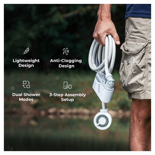 Doppia modalità doccia: personalizza la tua esperienza sotto la doccia con facilità. La nostra doccia portatile è dotata di due modalità: una modalità a flusso elevato per una cascata energizzante e una modalità a flusso delicato per un'esperienza rilassante, simile a quella di una spa.