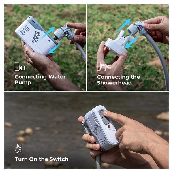 Facile montaggio, facile smontaggio: configurare la tua Max Shower è un gioco da ragazzi. Non sono necessarie installazioni o strumenti complessi. Immergi semplicemente la pompa in una fonte d'acqua, seleziona la modalità e l'impostazione di resistenza desiderate e goditi una doccia rinfrescante.