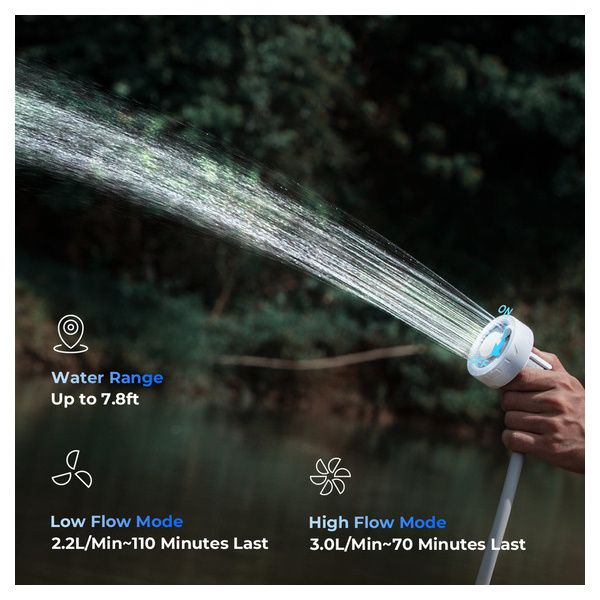 Modalità a flusso basso: flusso 2,2 l/min, 110 minuti di durata: per i viaggi più lunghi o i momenti di relax, la nostra modalità di resistenza offre un'esperienza di doccia/pulizia costante e confortevole.