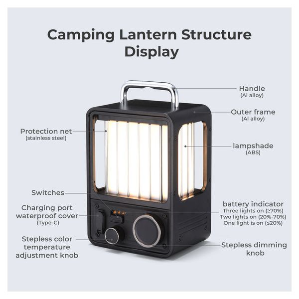 Passa facilmente dalle luci intense per lavorare all'aperto di notte alle luci soffuse che creano un'atmosfera rilassante. Ruotando invece la manopola a sinistra è possibile scegliere tra luce bianca e calda a seconda della scena e dell'umore. Il motivo per cui utilizziamo manopole anziché pulsanti per regolare la luminosità e la temperatura del colore è perché vogliamo che tu accenda le tue luci preferite in modo nostalgico e intuitivo.