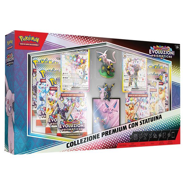 La collezione premium con statuina dell'espansione Scarlatto e Violetto - Evoluzioni Prismatiche del GCC Pokémon contiene: