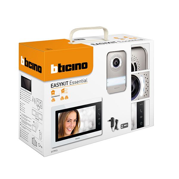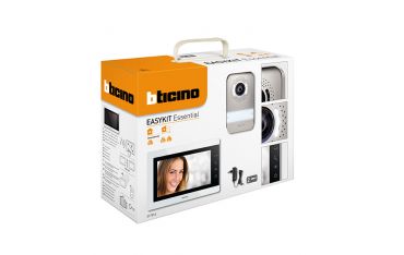 Kit Videocitofono a 2 Fili Bticino Easykit Essential con Monitor a Colori Touch Screen da 7 pollici e Pulsantiera Esterna con Telecamera grandangolare a 95°. Installazione semplificata dal collegamento tra pulsantiera esterna e videocitofono con soli 2 fili. Possibilità di sostituirlo senza nessun problema al vecchio impianto citofonico audio.