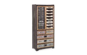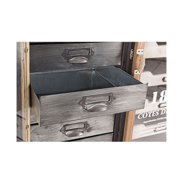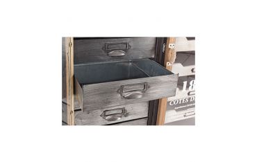 Struttura in legno di pino. Schienale in compensato. Cassetti in zinco e legno di pino. Vano porta comprensivo di cassetti. Maniglie in acciaio. Finitura a base di nitrocellulosa.
