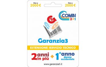 GARANZIA3 COMBI è il servizio di assistenza tecnica finalizzato ad una singola riparazione esclusivamente in caso di danno accidentale nei primi 12 mesi dalla data d’acquisto del prodotto ed alla prosecuzione della garanzia del produttore 2 per anni, che rinnova nel tempo tutti i servizi garantiti dalle aziende produttrici.