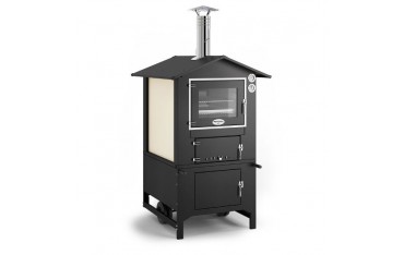 Forno a combustione indiretta. La dimensione della camera di cottura è 42×80 cm, con una altezza di 40 cm che permettedi cuocere su tre livelli. Fornito di piastra refrattaria certificata per usi alimentari, il forno è ideale per la cottura di pane, pizza, arrosti e qualsiasi altro piatto. Massimo isolamento della temperatura all’interno grazie ai 14 cm di lana di roccia naturale, la temperatura desiderata viene raggiunta con estrema facilità e con il solo impiego di 3,5 kg di legna. Il mantenimento del fuoco avviene, poi, con solamente 1 kg di legna per ora. La struttura interna è in acciaio inox, l’esterno è in acciaio elettro-zincato anti-ruggine e vernice a polveri. Provvisto di sistema di ventilazione interna a 12 Volt e pratica illuminazione. Fornito con un pratico carrello per il più ampio spostamento, canna fumaria con cappello anti-pioggia, due griglie, due padelloni di cottura, termometro e contaminuti.