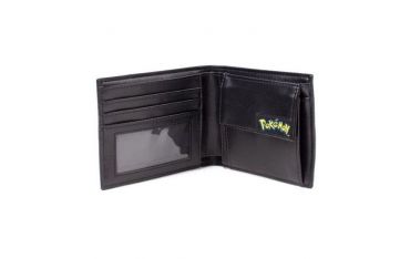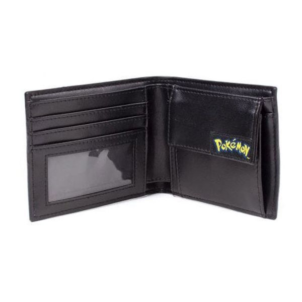 Portafoglio bifold con ricamo pokeball cucita e scomparti per carte, finestra in PVC trasparente e tasca portamonete con bottone automatico nascosto.