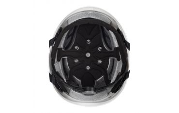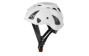 Il cinturino a quattro punti di attacco, regolabile con chiusura e apertura a sganciamento rapido, è certificato EN 397. È inoltre completo di devider laterale per regolare la lunghezza dei nastri e anche di un anello per poter agganciare il casco all’imbracatura.