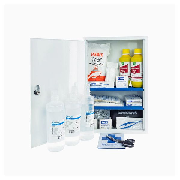 Armadietto metallico in lamiera ad anta unica. Contenuto secondo l’All. 1 del D.lgs. 81/2008-D.M.388/2003 per aziende del gruppo AB con più di tre lavoratori.