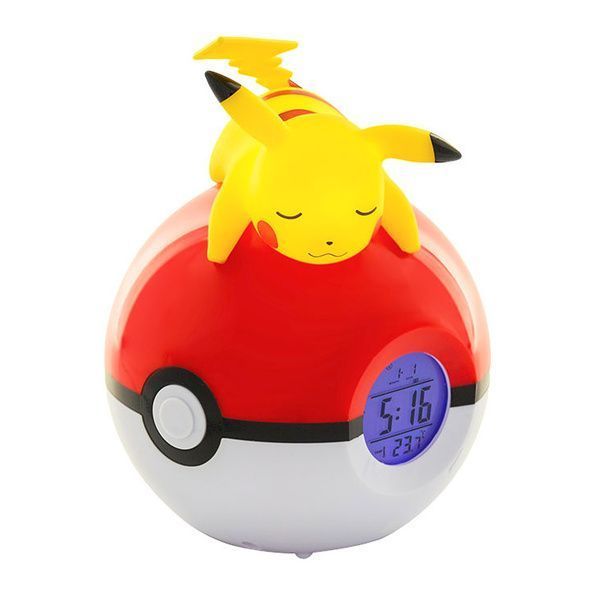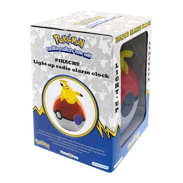 Sveglia digitale FM con lampada a LED raffigurante il Pokemon Pikachu che dorme sulla Poke Ball, batterie richieste 3 x AAA (non incluse) o adattatore AC, display digitale (ora/data/temperatura), sveglia programmabile. Altezza 16 cm.Clicca qui per scaricare la presentazione dei prodotti Teknofun.