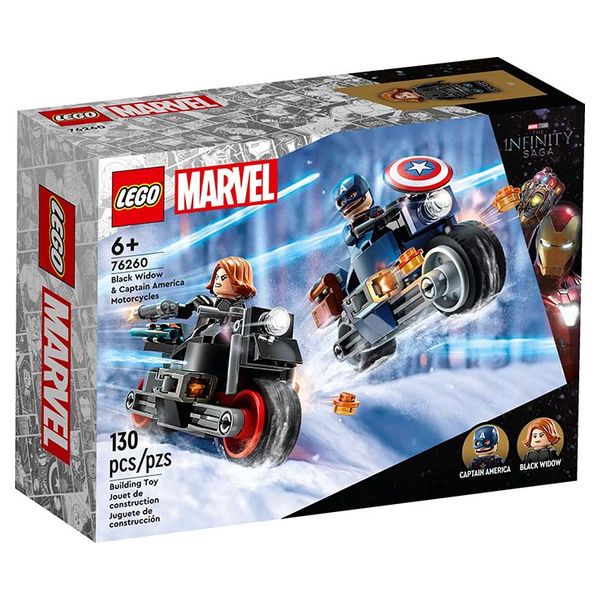 Questo set comprende le minifigure dei personaggi di Captain America e di Black Widow, oltre a 2 moto giocattolo da costruire. Entrambe le motociclette dei supereroi sono dotate di shooter laterali e di supporti per il bastone di Black Widow e per lo scudo di Captain America. Le minifigure possono essere facilmente rimosse dalle moto giocattolo, per entrare subito in azione. Un divertente set di giochi LEGO Marvel da collezione, perfetto come regalo di compleanno per i fan dei film del Marvel Cinematic Universe.