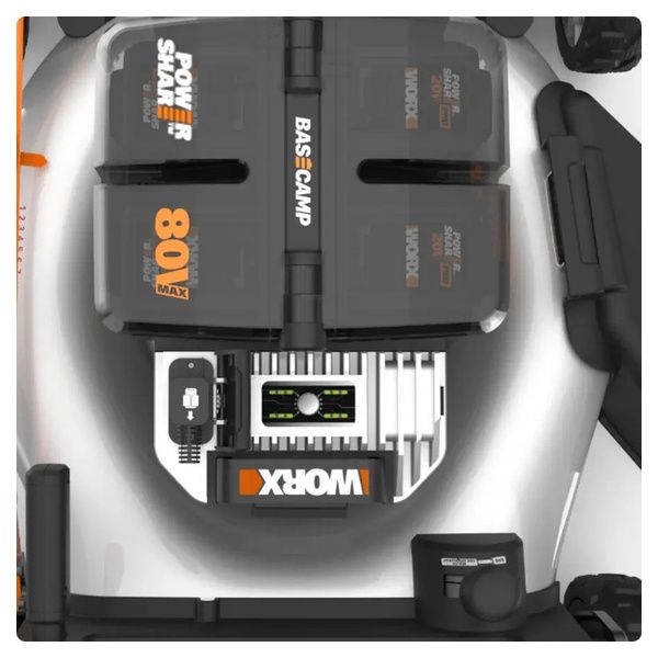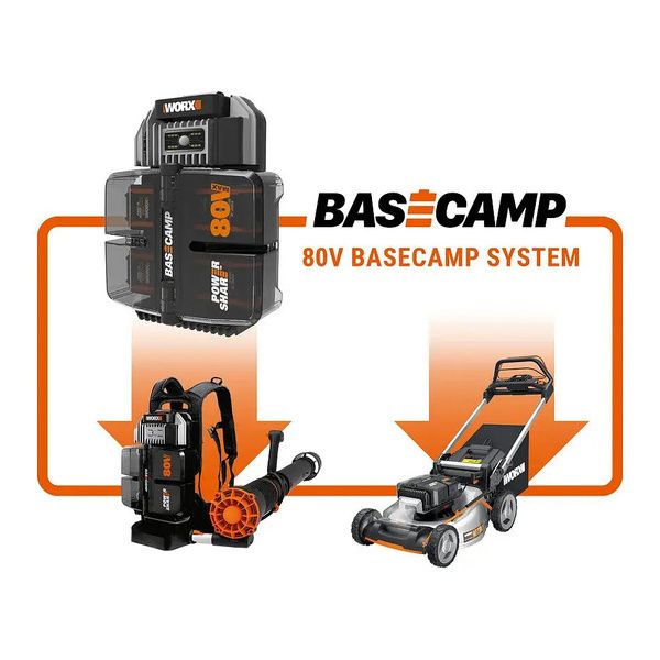 Come centrale elettrica mobile, il sistema Worx Basecamp può essere rimosso con un solo pulsante per essere condiviso con il soffiatore a zaino da 80V. È inoltre possibile condividere le batterie del Basecamp con altri utensili PowerShare da 20V, 40V e 80V, con un'estrema convenienza economica.