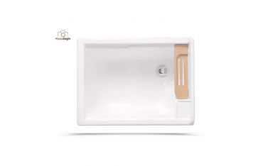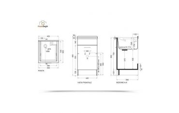 Il mobile si presenta in truciolare nobilitato da 18 mm, con frontali in laminato lucido celeste. L'apertura dell'anta è con maniglia cromata. Viene fornito di tavola lavapanni in legno massello, sifone e troppopieno.