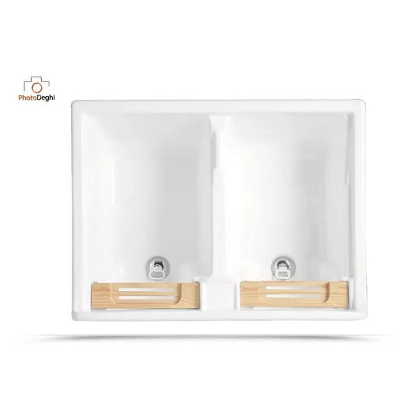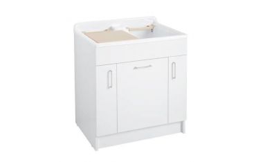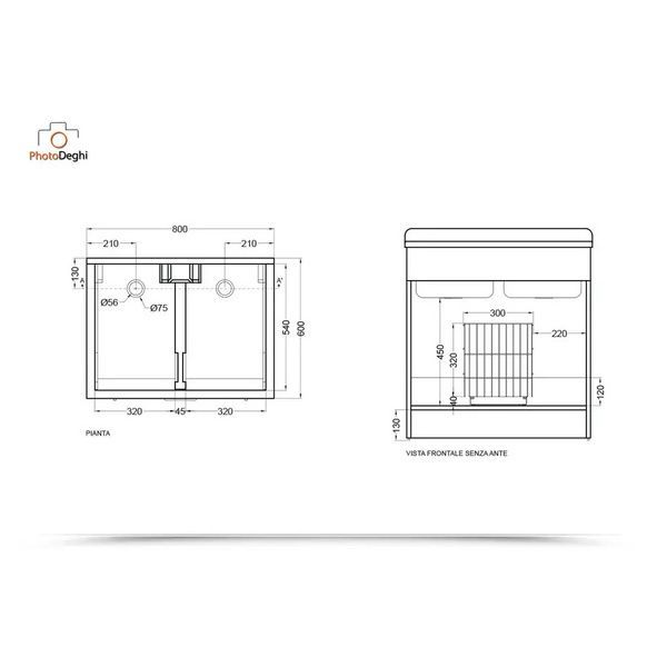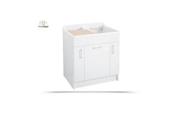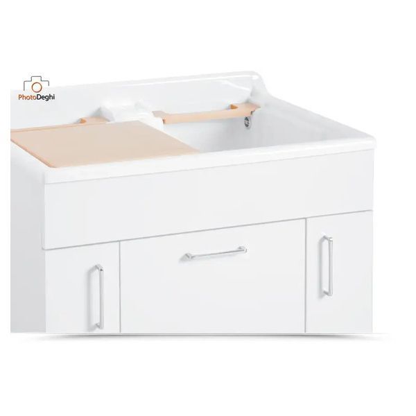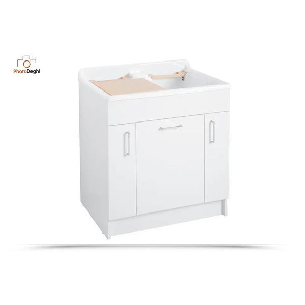 Il mobile si presenta in truciolare nobilitato da 18 mm, con frontali in laminato lucido bianco. L'apertura delle ante e del cassettone è con maniglia cromata. Viene fornito di cesto portabiancheria, tavola lavapanni in legno massello, sifone e troppopieno.