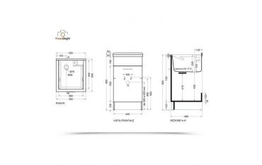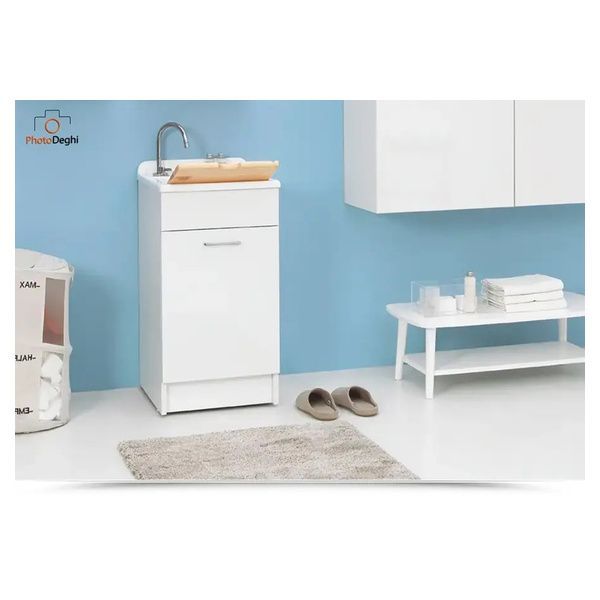 Il mobile si presenta in truciolare nobilitato da 18 mm, con frontali in laminato lucido bianco. L'apertura dell'anta è con maniglia cromata. Viene fornito di tavola lavapanni in legno massello, sifone e troppopieno.