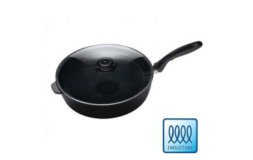 Una pentola polivalente. Perfetta per spadellare verdure e per le preparazioni più varie. Ideale per fritture. Con contromaniglia e bordi alti per far saltare più facilmente le pietanze. Dimensioni cm 28 di diamentro per cm 7,5 di altezza. Manico ergonomico e contromaniglia. Compreso coperchio in vetro temperato con uscita del vapore regolabile. Qualità Swiss Made, rivestimento antiaderente rinforzato con polvere di diamante. Consente di cucinare senza condimenti.