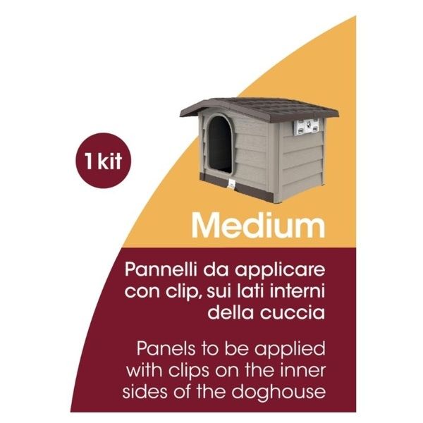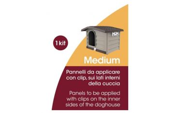 Kit di pannelli isolanti da applicare all'interno della cuccia per migliorare l'isolamento termico. I pannelli sono semplici da applicare grazie alle predisposizioni presenti sulla cuccia e alle clip in dotazione. Istruzioni di montaggio presenti all'interno della confezione.