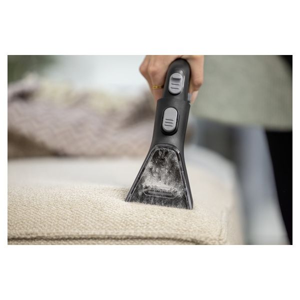 Tubo ultraflessibile 2 in 1 Tubo spruzzatore integrato per una maggiore comodità durante la pulizia. Tubo di aspirazione lungo e flessibile per una maggiore comodità durante la pulizia. Maniglia con funzione di blocco per la spruzzatura continua durante la pulizia di grandi superfici tessili.