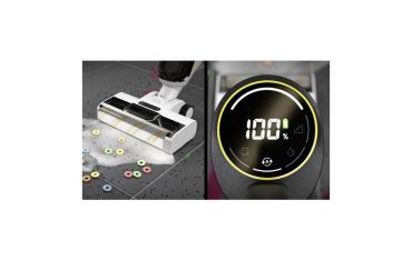 Pulizia intelligente con Dynamic!Control e Vision!Clean La modalità automatica intelligente con sensore di sporco Dynamic!Control adatta automaticamente la potenza di aspirazione e la quantità di acqua al grado di sporco, per la massima autonomia. Informazioni importanti come l'autonomia rimanente o la modalità di pulizia sono sempre visibili sull'ampio display Vision!Clean da 3,2 pollici. Indicazione intelligente del livello del serbatoio con protezione contro il troppo pieno e spegnimento automatico se il serbatoio dell'acqua sporca non viene svuotato.