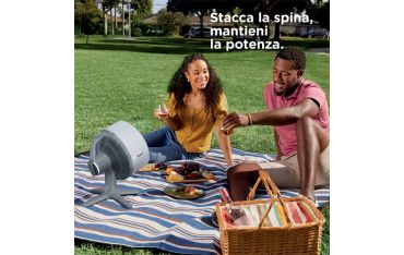 Ventilatore da tavolo per interni ed esterni, con e senza fili. 5 velocità , oscillazione a 180° e inclinazione verticale a 55°. Autonomia di 24 ore senza cavo. Telecomando incluso.