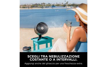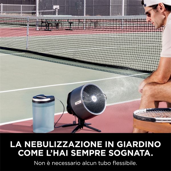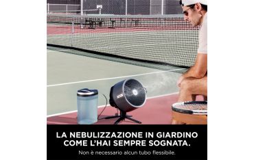 Ventilatore 2-in-1 per interni ed esterni, con e senza filo. Nebulizzazione continua o a impulsi fino a 3 m per abbassare la temperatura percepita fino a 5°. 5 velocità , oscillazione a 180° e inclinazione verticale a 55°. Tecnologia H2PRO portatile senza tubo. Design trasformabile, ultra-potente e silenzioso. Autonomia fino a 24 ore senza cavo. Serbatoio d'acqua da 4,5L staccabile. Telecomando incluso.