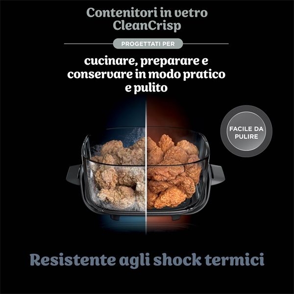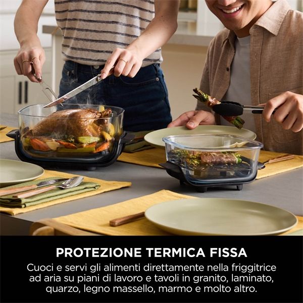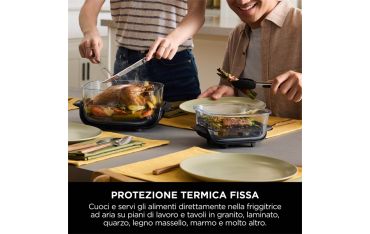 Cuoci e servi gli alimenti direttamente nella friggitrice ad aria su piani di lavoro e tavoli in granito, laminato, quarzo, legno massello, marmo e molto altro. I contenitori in vetro CleanCrisp sono dotati di piedini termoresistenti per proteggere le superfici e PowerPod di poli termoresistenti per essere appoggiato in modo sicuro.