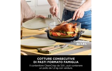 Passa dal contenitore grande da 3,8 L per grandi porzioni al contenitore piccolo da 1,4 L per piccole porzioni o contorni. Prepara un pasto monoporzione in meno di 15 minuti o un pollo intero da 1,2 kg con verdure. CRISPi PowerPod rileva quale contenitore CleanCrisp stai utilizzando e imposta la temperatura di cottura più adatta. Perfetta per preparare i pasti della settimana, pranzi e cene in famiglia, buffet per le feste e molto altro.