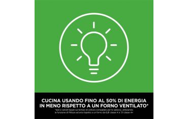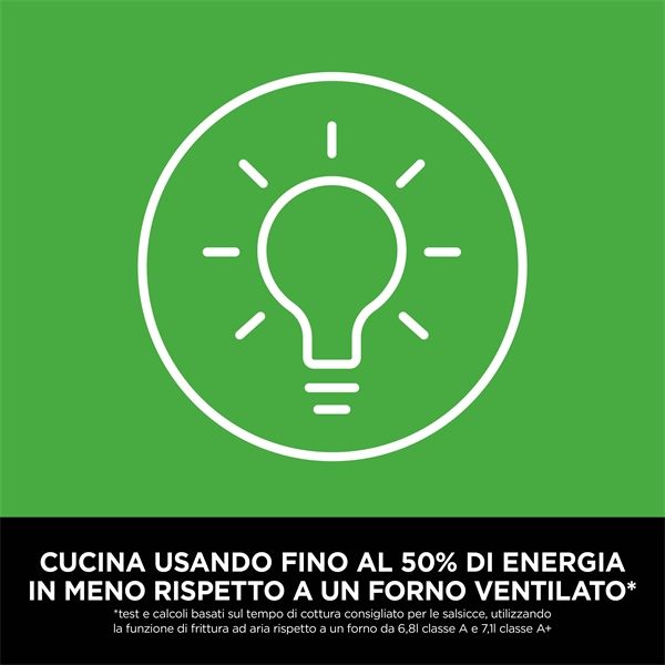*Test e calcoli basati sul tempo di cottura consigliato per le salsicce, utilizzando la funzione di frittura ad aria rispetto a un forno da 6,8l classe A e 7,1l classe A+.