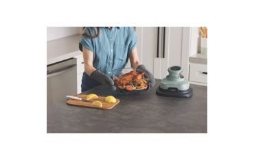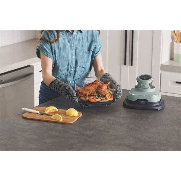 Cuoci e servi gli alimenti direttamente nella friggitrice ad aria su piani di lavoro e tavoli in granito, laminato, quarzo, legno massello, marmo e molto altro. I contenitori in vetro CleanCrisp sono dotati di piedini termoresistenti per proteggere le superfici e PowerPod di poli termoresistenti per essere appoggiato in modo sicuro.
