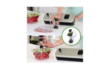 Sigilla in sacchetti pretagliati e rotoli creando sacchetti su misura; barra saldante da 23 cm; saldatura doppio spessore; tubo per contenitori con adattatore salva freschezza Adatta alla conservazione quotidiana con i sacchetti zip e contenitori salva freschezza; dotata di vassoio raccogli gocce.