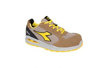 Scarpe antinfortunistiche Run A.Box Low Basse firmate Diadora, dotate di tomaia in pelle scamosciata e rete Poliestere, traspirante, puntale in alluminio 200J, inserto antiperforazione K-SOLE Ultralite, fodera Air Mesh in poliestere con antiscalzante in microfibra plantare anatomico estraibile microforato in PU espanso a celle aperte, con carboni attivi, interusola in EVA, battistrada in PU. Normative: S1PS FO SR ESD.