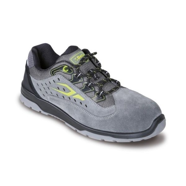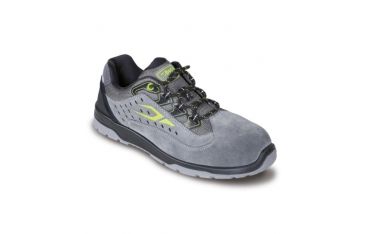 Scarpe antinfortunistiche con tomaia in pelle scamosciata traforata con supporto di stabilità al tallone. Suola in poliuretano bidensità e puntale in materiale polimerico, resistenza 200 Joule. Antiperforazione grazie alla fibra composita con trattamenti ceramici. Sottopiede anatomico con rialzo ammortizzante nella zona del tallone