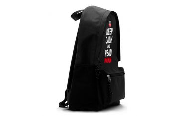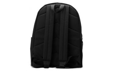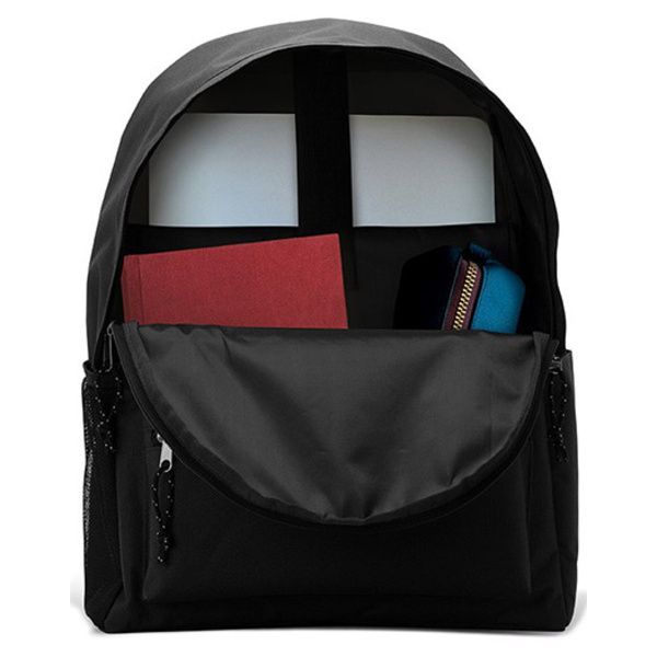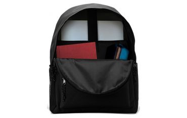 Zaino nero con tasca frontale e schienale imbottito. Materiale: 100% poliestere.