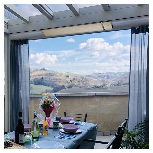 Radiatore a infrarossi per esterni serie A7 IR-C con nessuna emissione di luce. Elemento riscaldante in lega di alluminio estruso con verniciatura a infrarossi in ceramica. Staffa in acciaio inossidabile inclusa, adatta per il montaggio a soffitto e a parete. A prova di acqua: IP65, adatto per polvere e pioggia all'aperto. Raggiunge le migliori prestazioni in aree esterne o interne molto riparate e senza vento, come ad esempio giardini d'inverno.