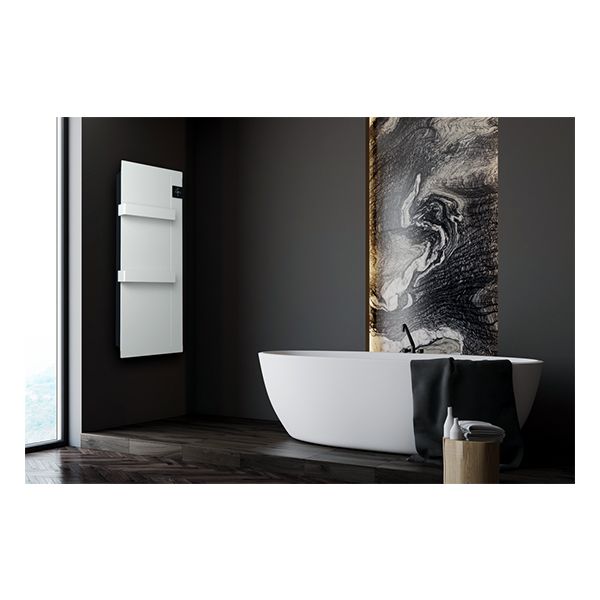 Radiatore scaldasalviette da bagno ONSEN con corpo interamente in metallo, per installazione fissa a parete. Ideale per l'installazione in bagni e luoghi umidi, ha una interfaccia utente digitale e il termostato elettronico per un controllo facile e preciso.