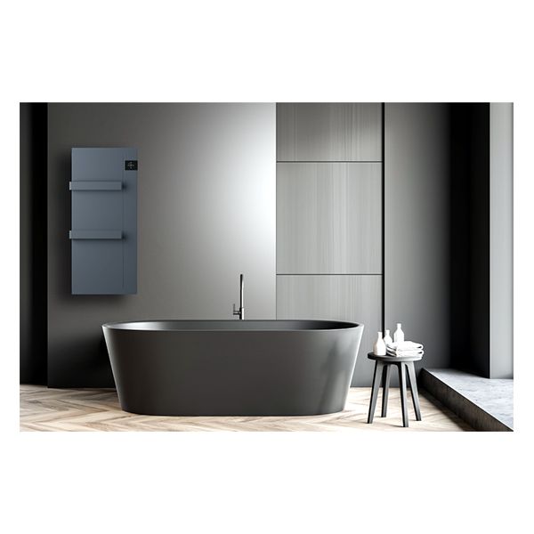 Radiatore scaldasalviette da bagno ONSEN con corpo interamente in metallo, per installazione fissa a parete. Ideale per l'installazione in bagni e luoghi umidi, ha una interfaccia utente digitale e il termostato elettronico per un controllo facile e preciso.