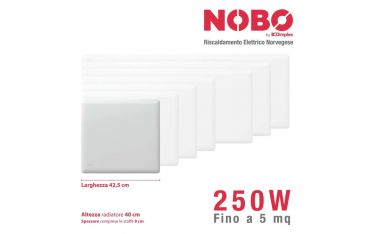 I radiatori elettrici norvegesi NOBO sono un sistema di riscaldamento convezione naturale ed a basso consumo. I corpi riscaldanti sono costituiti da una resistenza con ampia superficie di scambio termico e da un termostato digitale innovativo.