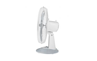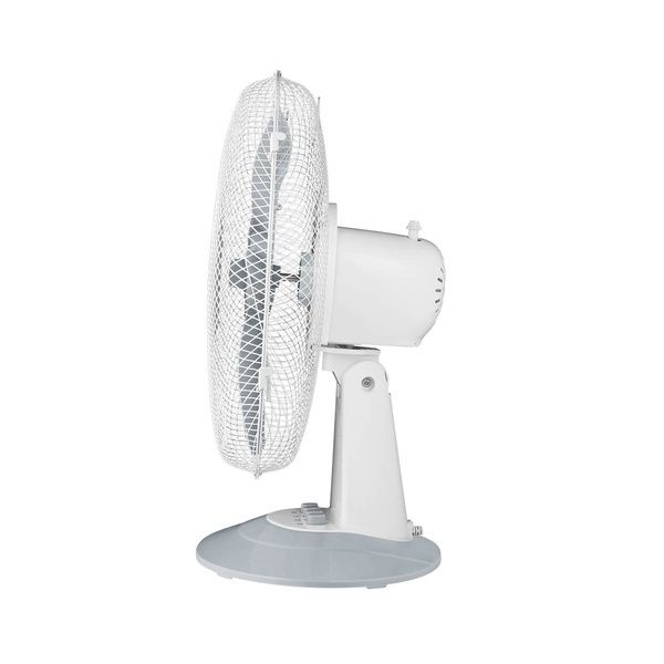 Ventilatore da tavolo Ø 40 cm, 5 pale, griglia a nido d’ape, oscillazione laterale automatica. Pale e dettagli grigi. Inclinazione verticale. Potenza 50W, 3 velocità.